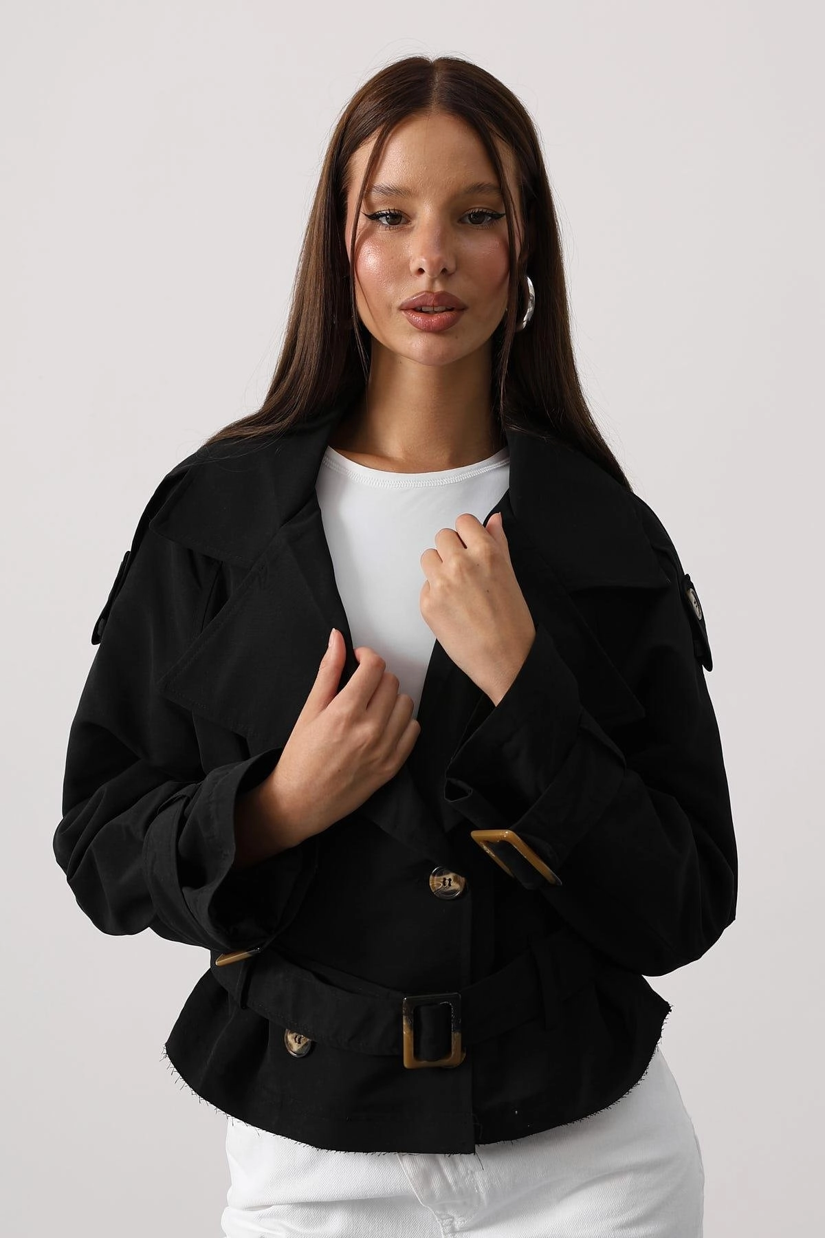 Meet your new go-to short trench coat: a sleek black cropped jacket with classic wide lapels, double-breasted buttons, shoulder epaulets, cuff tabs, and a waist belt for a tailored fit. This lightweight outerwear layers beautifully over tees or knits for spring or fall looks, working as streetwear o...