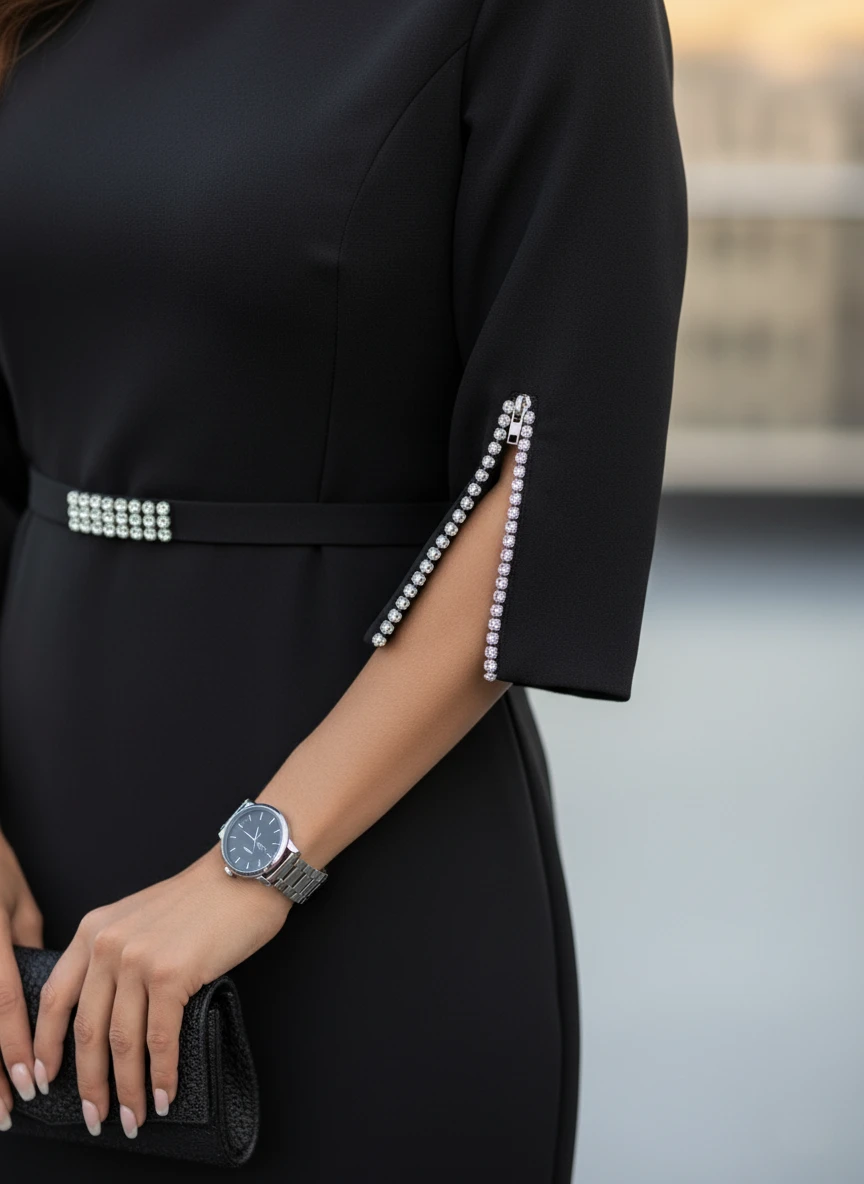 #black shift dress#60s mod clothing#rhinestone vintage#cocktail party#elegant miss#evening gown#little black dress#long sleeve dress#vintage 1960s#mother of bride#nye outfit#minimal goth#retro formal wear#holiday sparkle#classic lbd#diamante trim#crystal embellished#mod shift dress#california vintage#size large vintage#Dresses