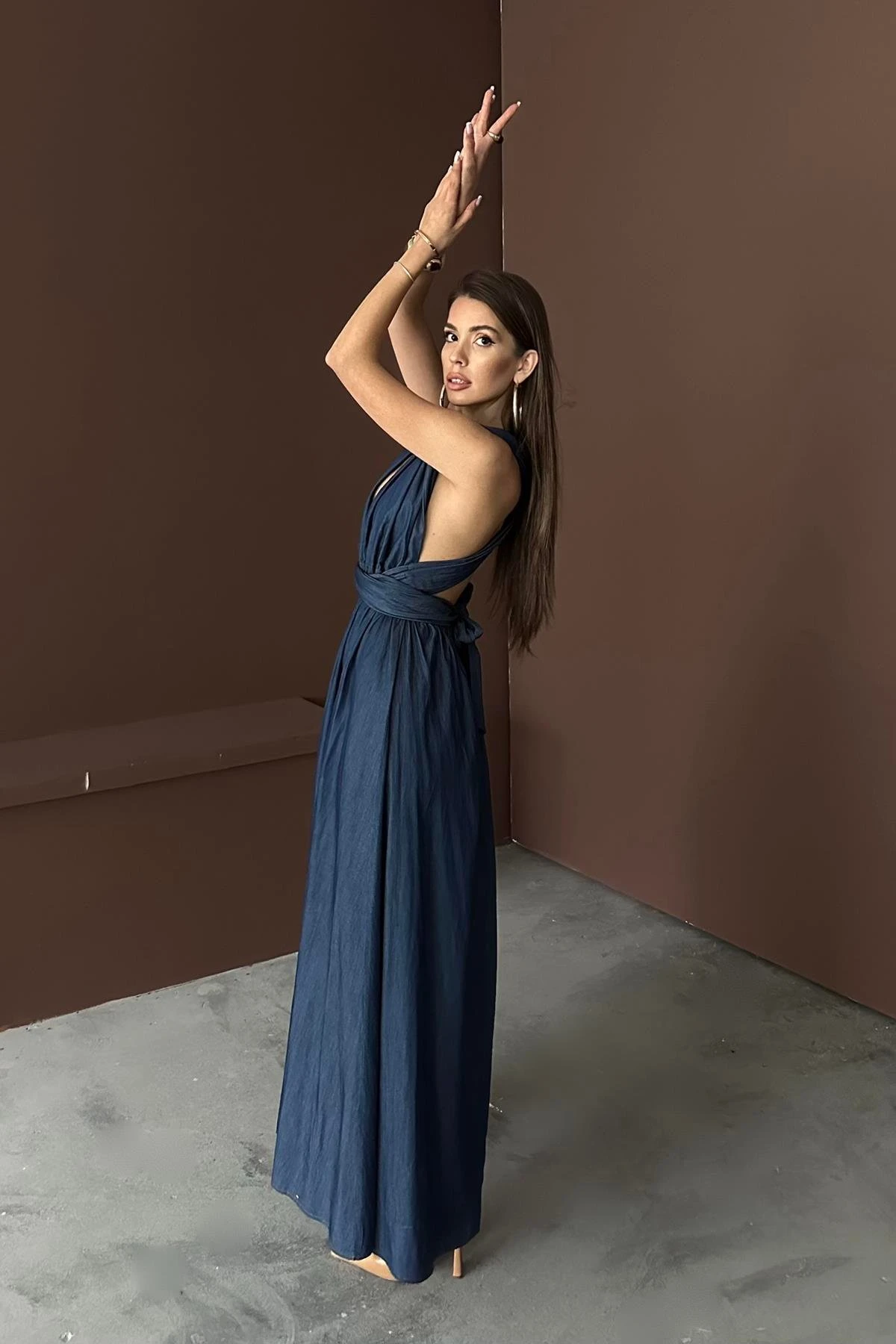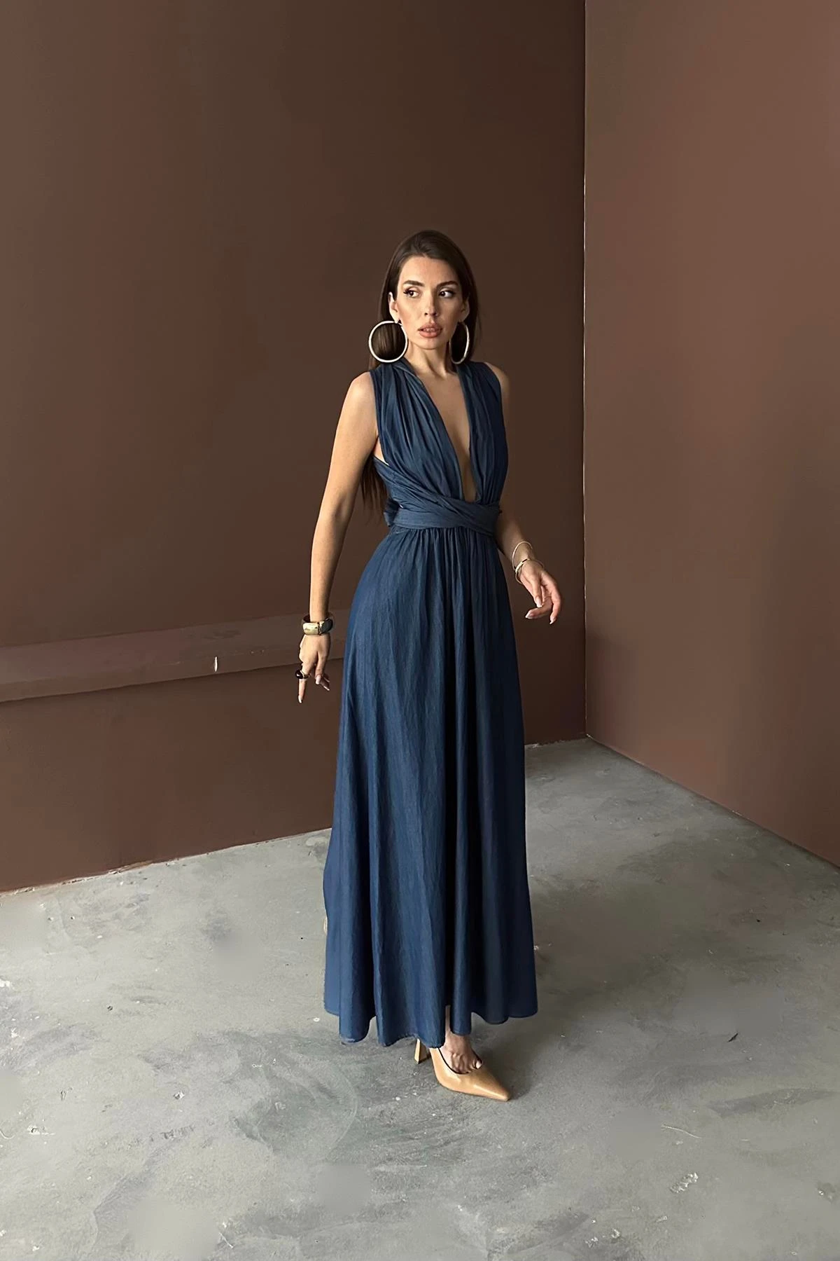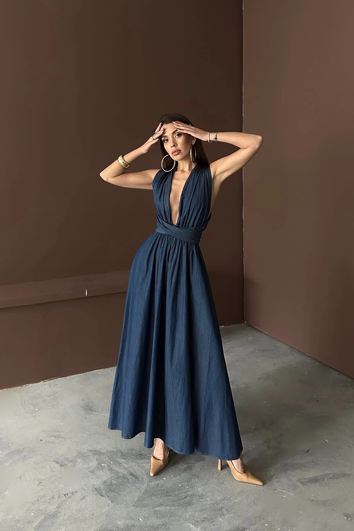 Blue Chambray Maxi Dress Halter Neck Deep V Neck Sleeveless Summer Dress