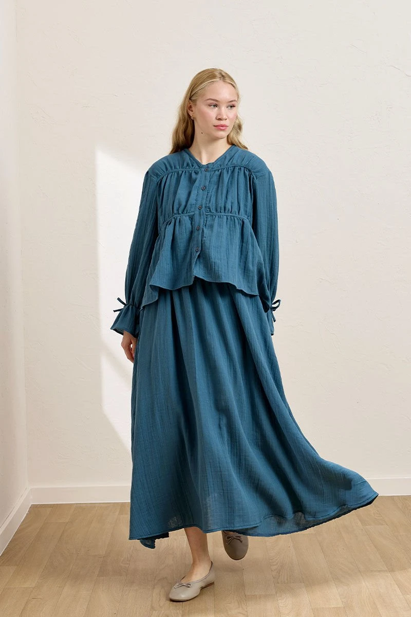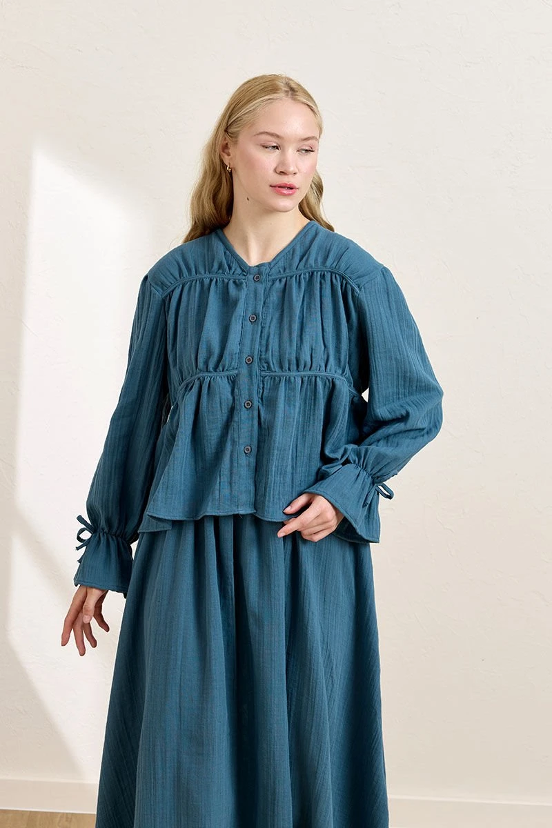 Blue Muslin Piped Blouse & Balloon Skirt Set