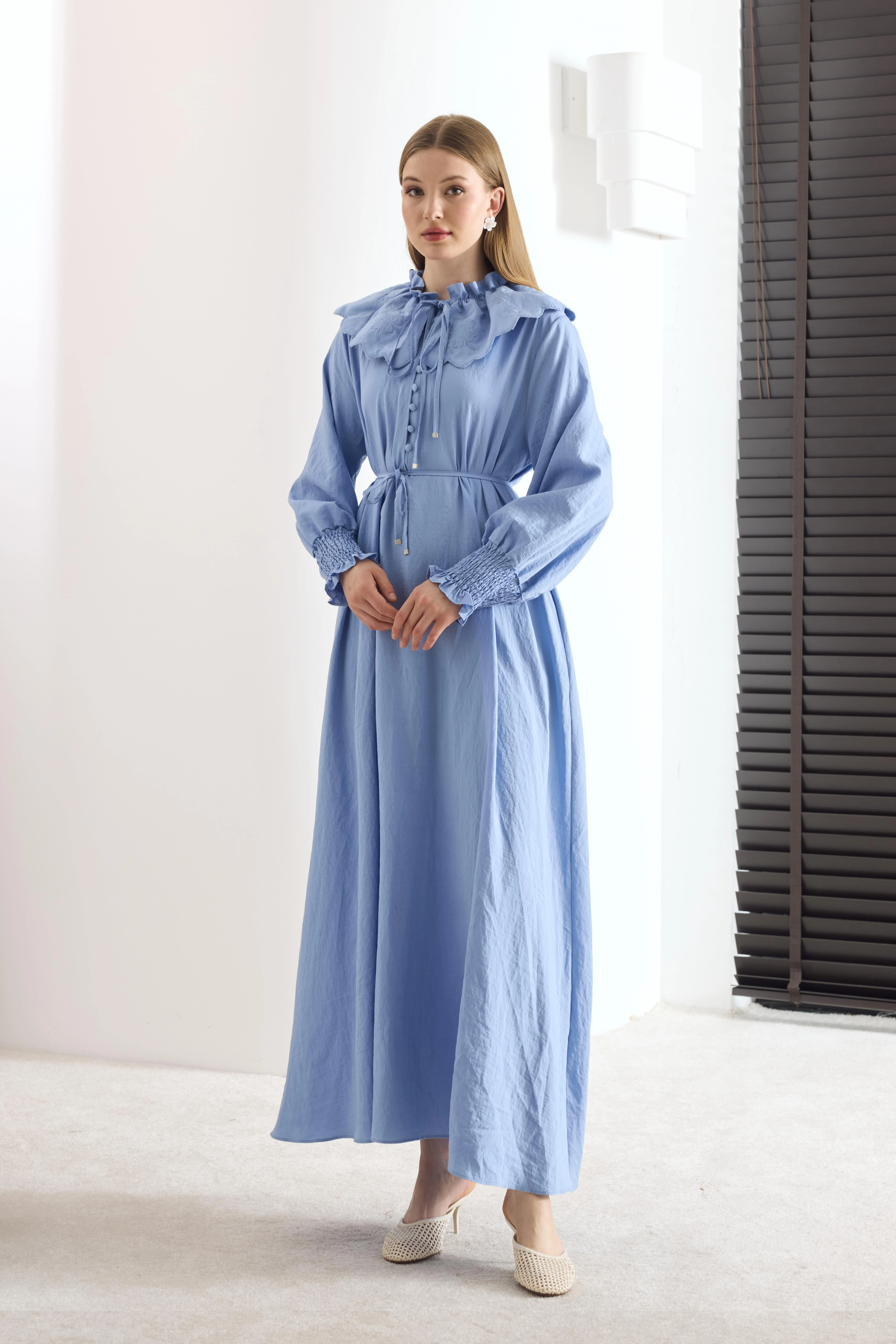 Blue Peasant Maxi Dress Long Sleeve Ruffle Collar Smocked Cuffs Button Front Tie Neck Boho Prairie Dress Custom Made Chambray ✨ Leave a 5-star review and get 10% off your next order! 🌟💙 Step into bohemian elegance with this stunning blue peasant maxi dress! 💙 This enchanting piece features a roma...