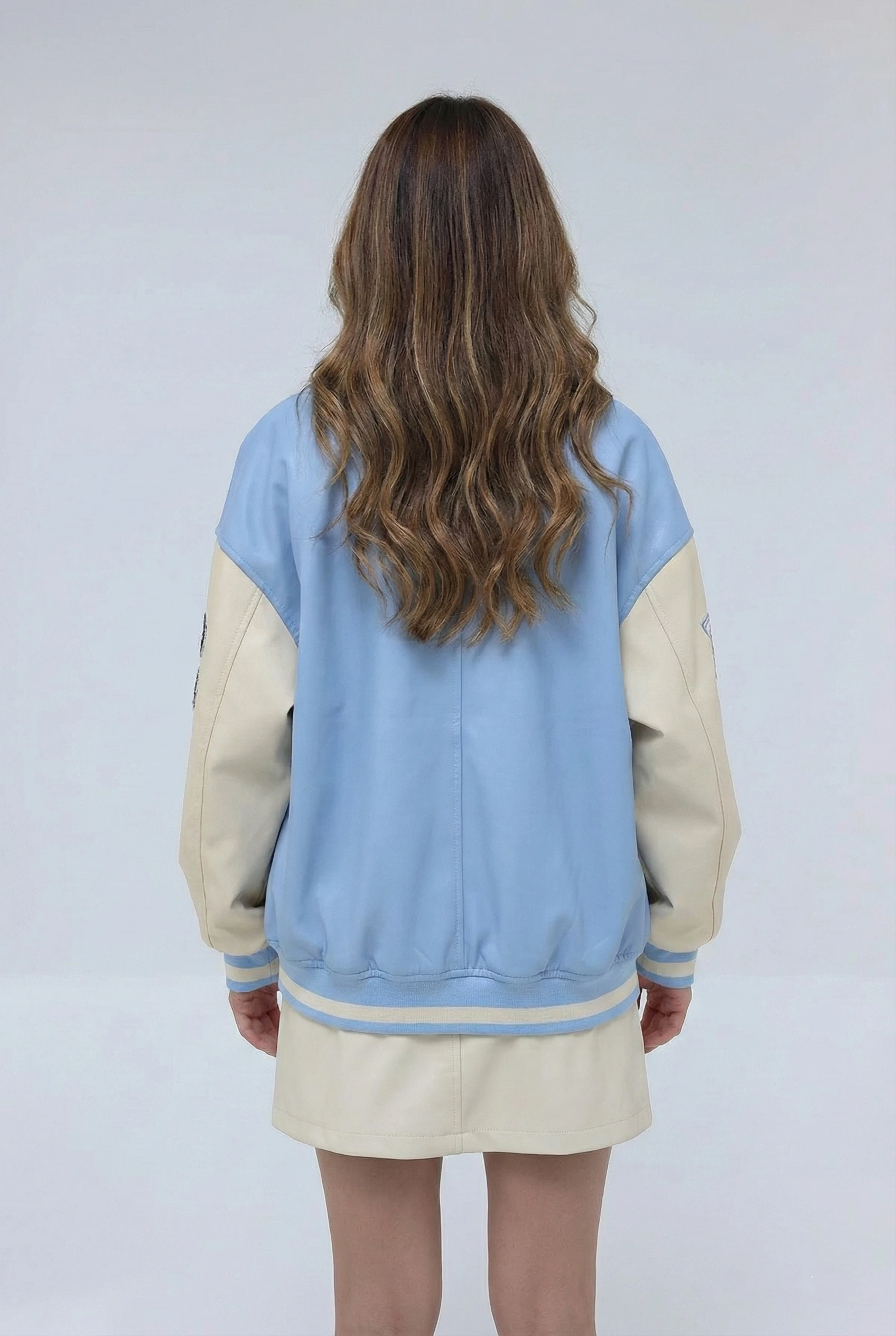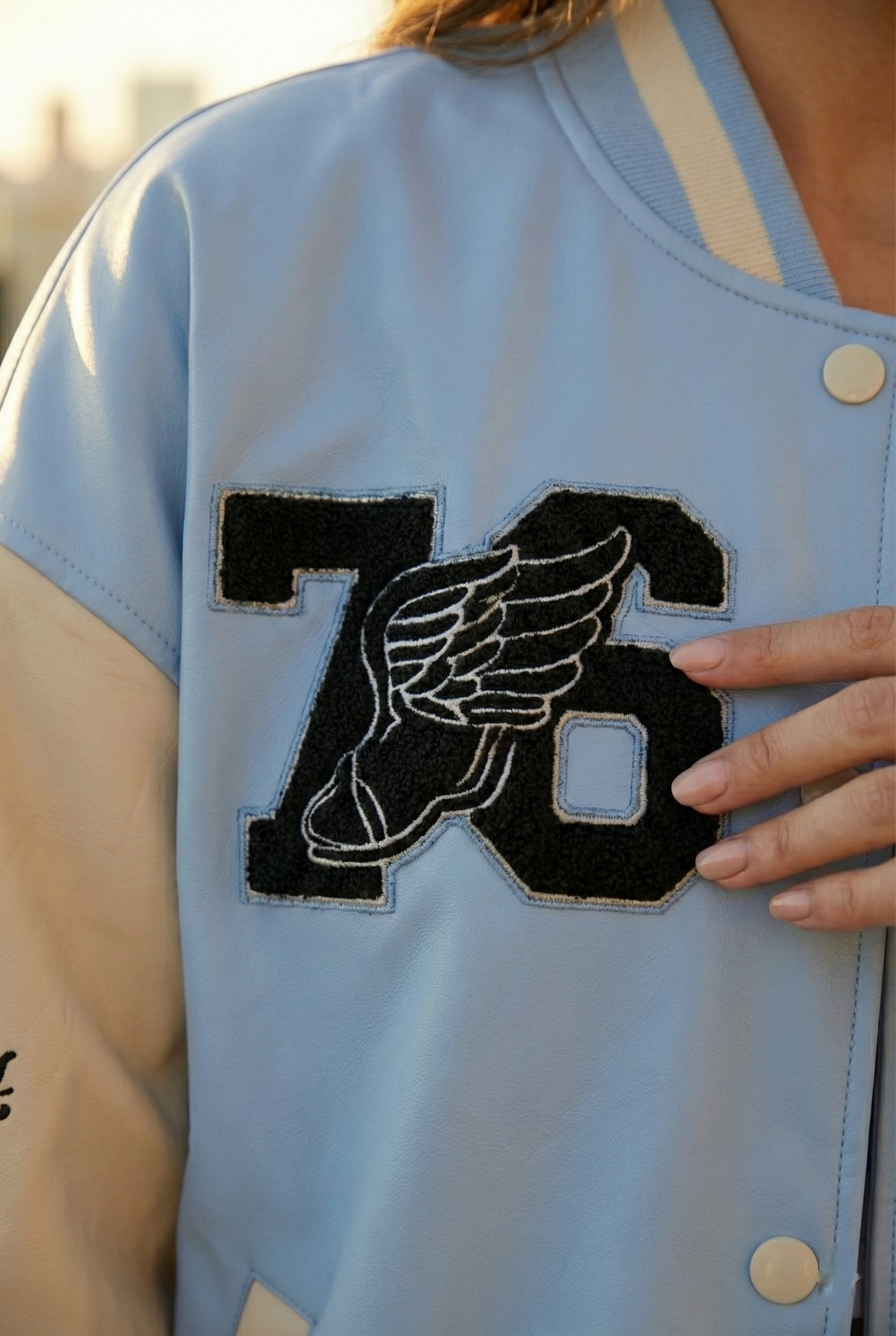 #varsity jacket#bomber jacket#letterman jacket#baby blue coat#y2k streetwear#old money aesthetic#wool leather jacket#oversized jacket#preppy style#76 patch jacket#retro sportswear#unisex clothing#pastel goth#champion jacket#fall outerwear#trendy jacket#boyfriend gift#college outfit#hip hop fashion#blue and cream#Jacket