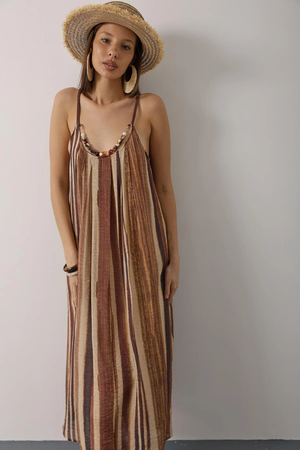 Bohemian Maxi Dress Spaghetti Strap Earth Tones Striped Beaded Neckline Summer Boho Dress Festival Dress