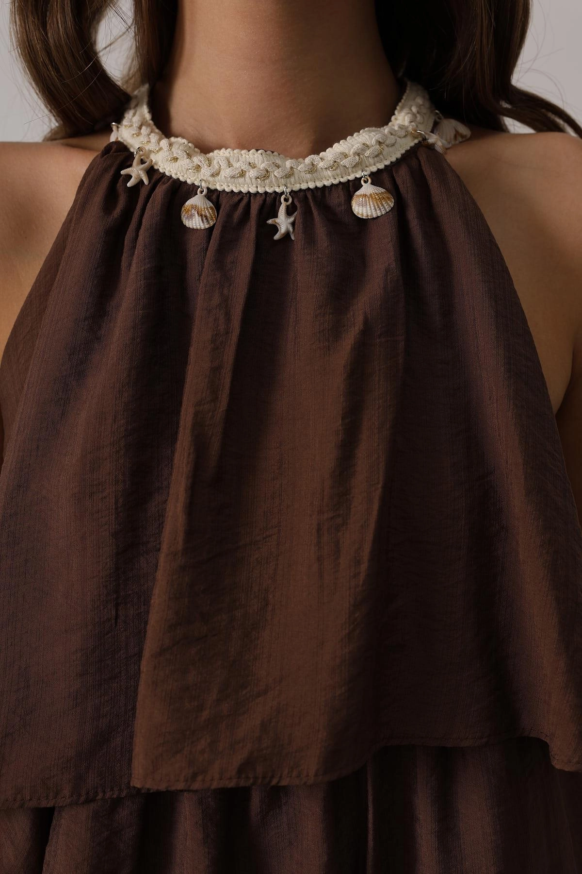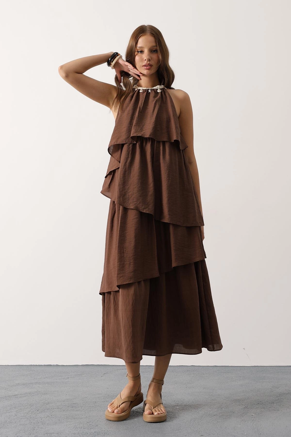 Brown Tiered Halter Maxi Dress Shell Charm Boho Summer Beach Dress Women Bohemian Ruffle Dress Step into effortless bohemian elegance with this stunning brown tiered maxi dress! ✨ Featuring a flattering halter neckline adorned with charming shell and starfish details, this dress captures the perfec...