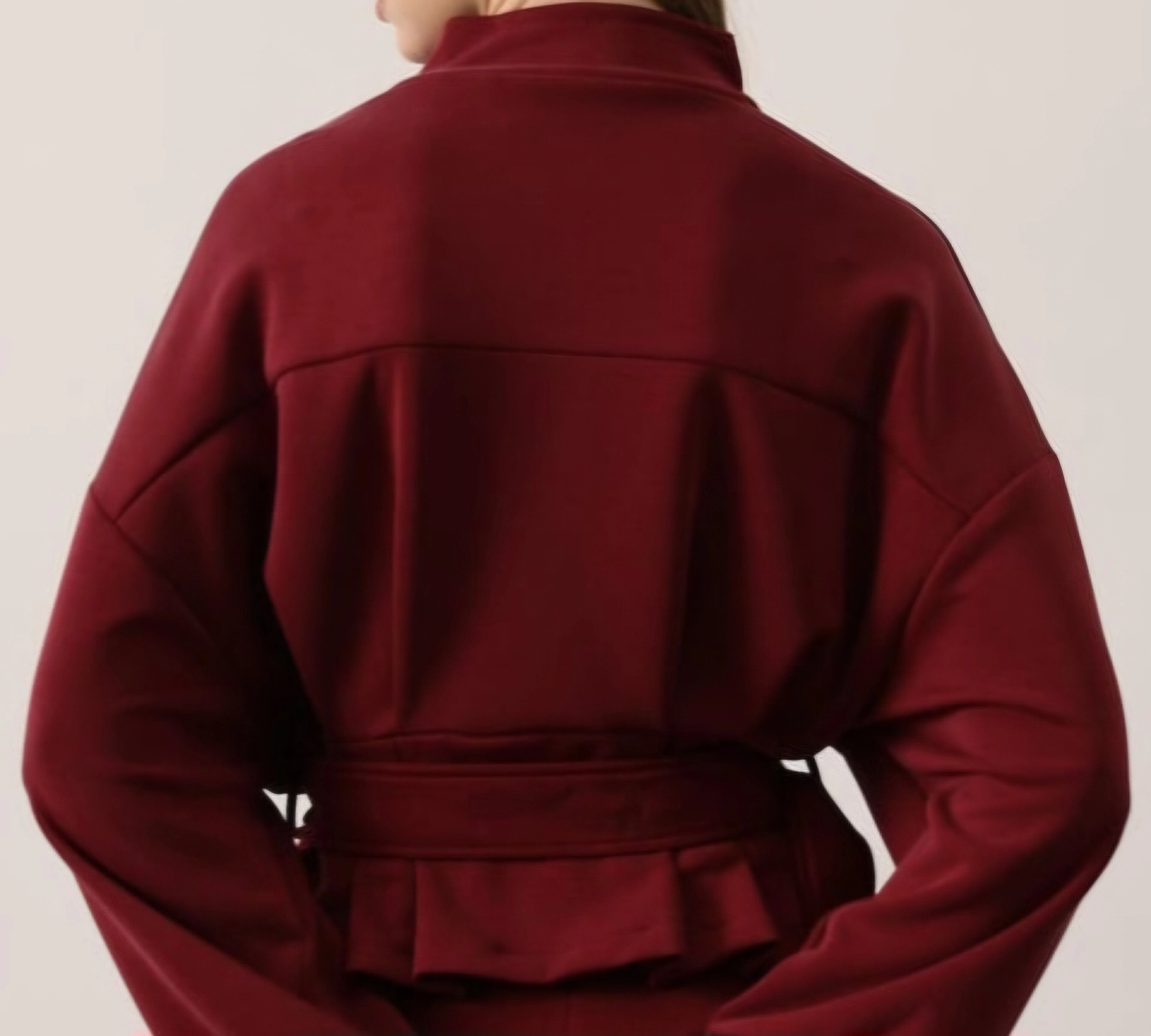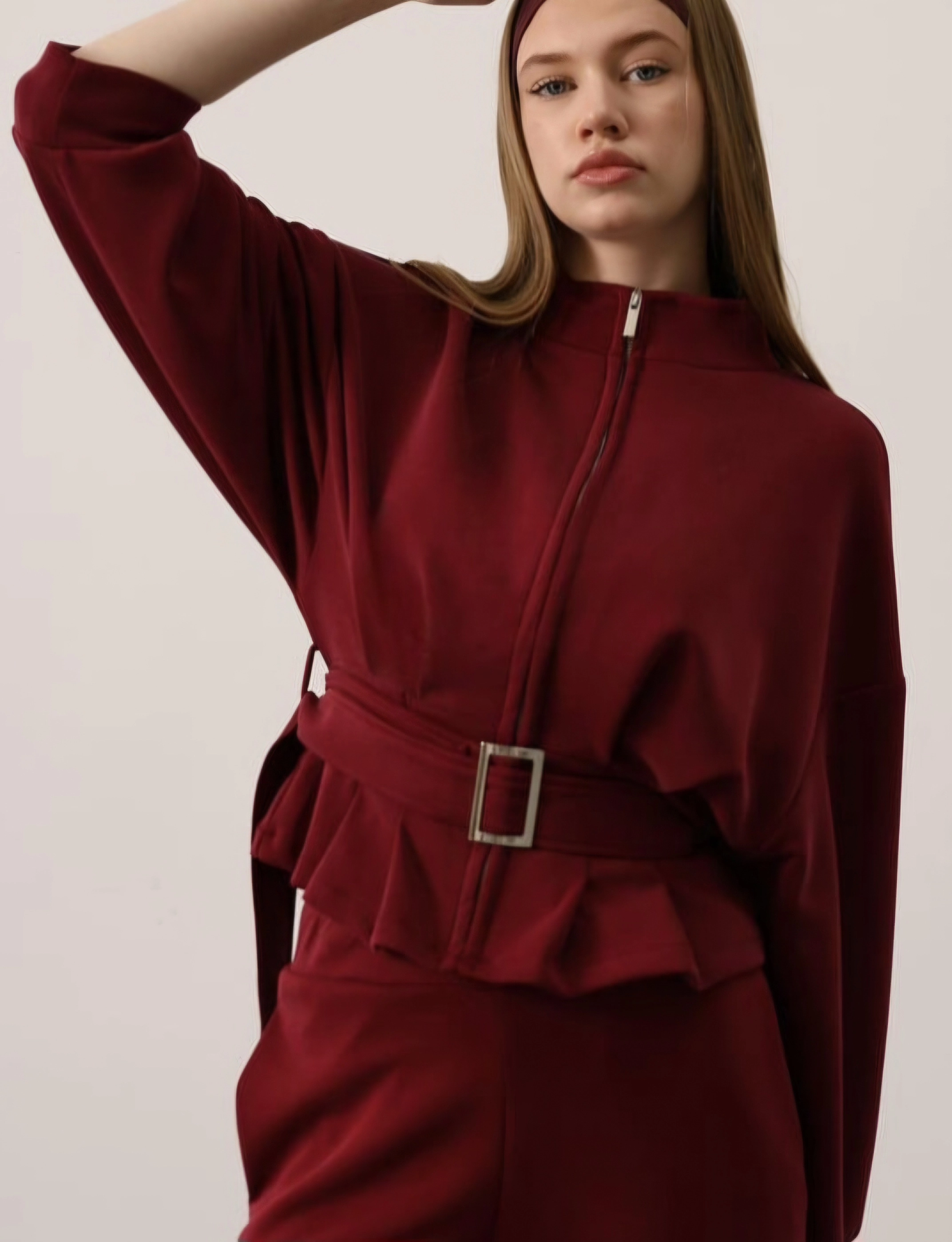 #Burgundy Belted Peplum Jacket#High Neck Long Sleeve Zip-Up#Modest Sweatshirt#Trendy Modest Fashion#Fall Fashion Wear#Winter Outfit#Elegant Loungewear#Street Style Fashion#Trendy Streetwear#Two Piece Set#Burgundy Sweatshirt#Zip-Up Top#Chic Boho Sweatshirt#Bohemian Wear#Casual Outfit#Long Sleeve Top#Stylish Comfort Wear#Blouse#blouse