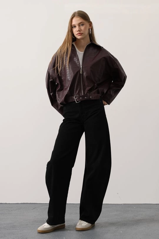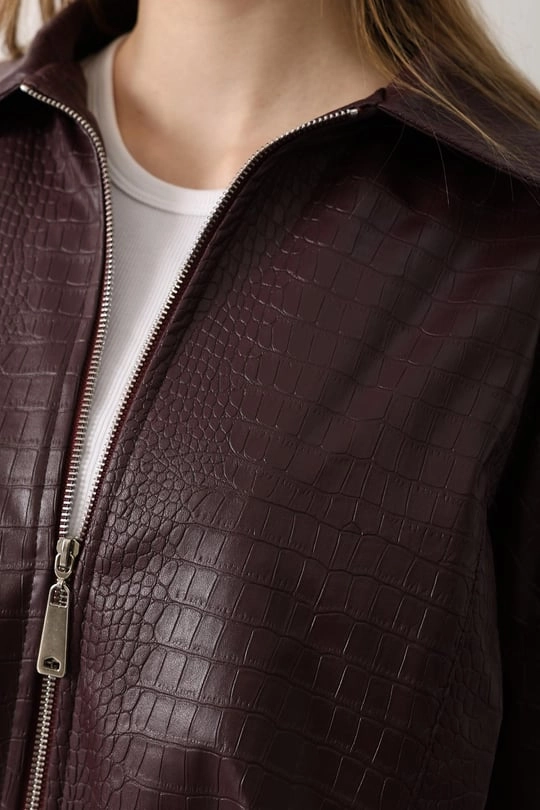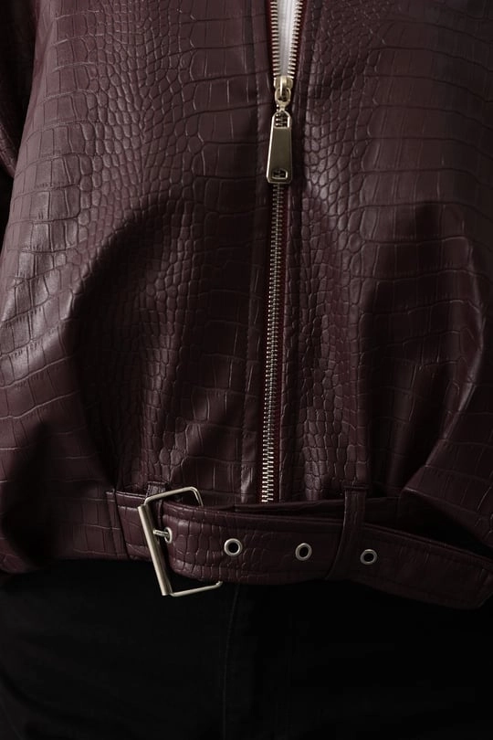 Fabric & Texture: Faux leather (PU) with an embossed crocodile-skin texture, giving it a premium and bold appearance. Color: Deep burgundy / wine — elegant and unique compared to common black or brown leather jackets. Cut & Silhouette: Slightly oversized with a boxy fit, designed for layering and ...