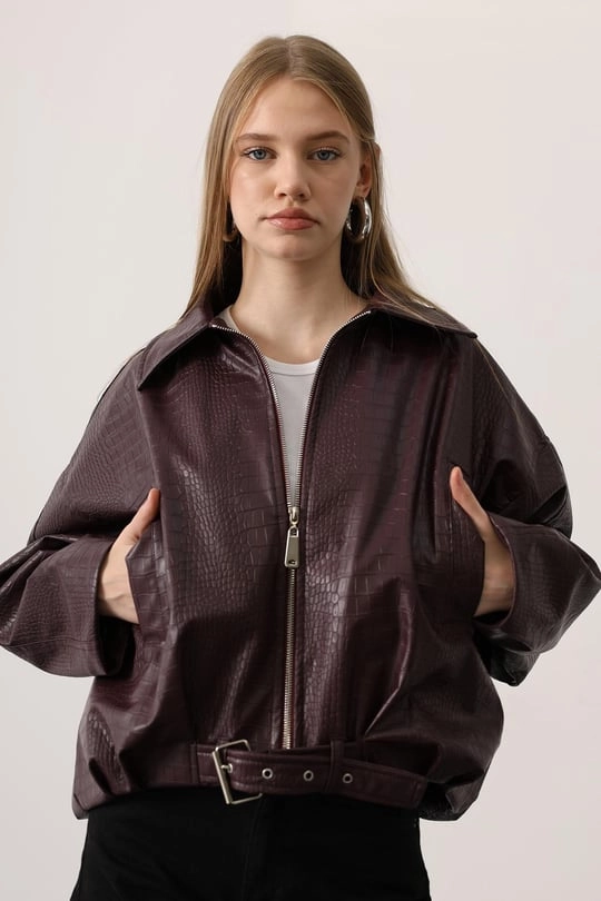 Burgundy Croc Embossed Faux Leather Jacket with Belt – Oversized Women’s Statement Outerwear, Chic Fall Winter Street Style Coat