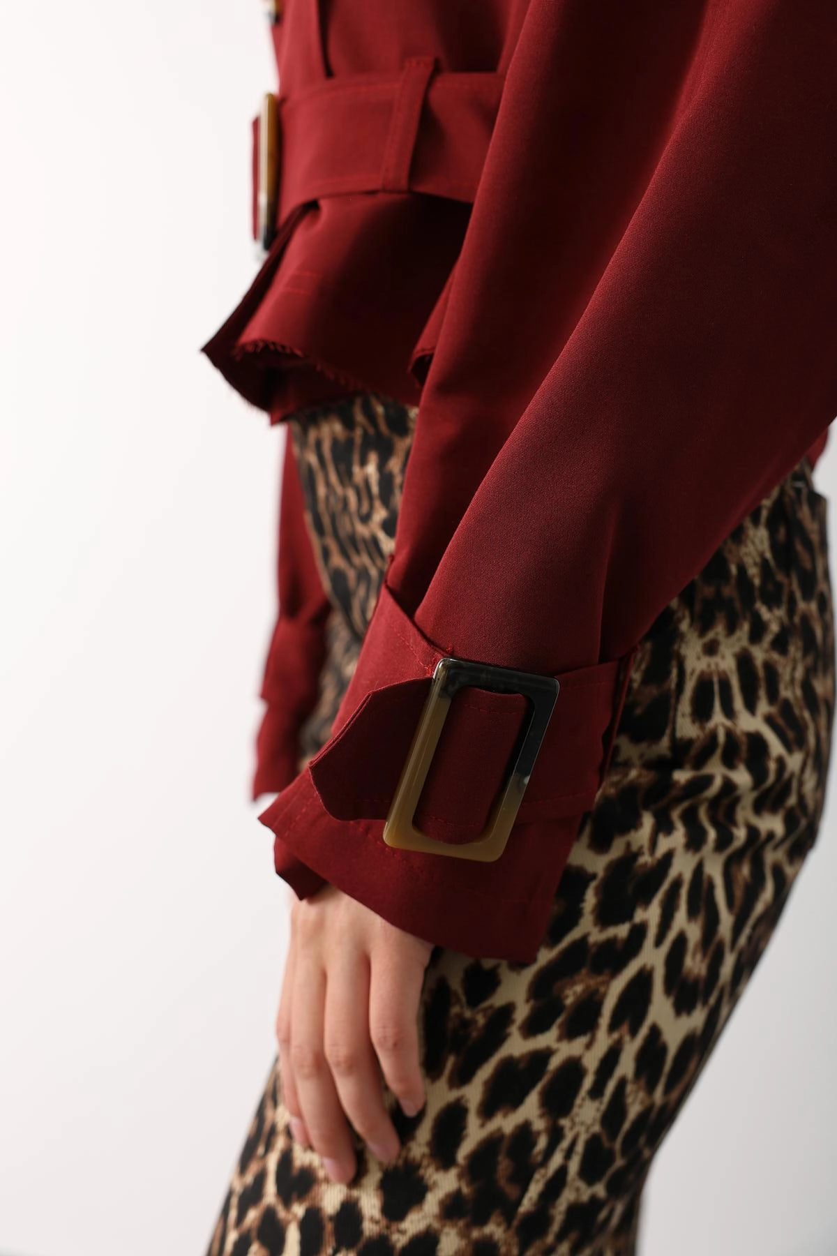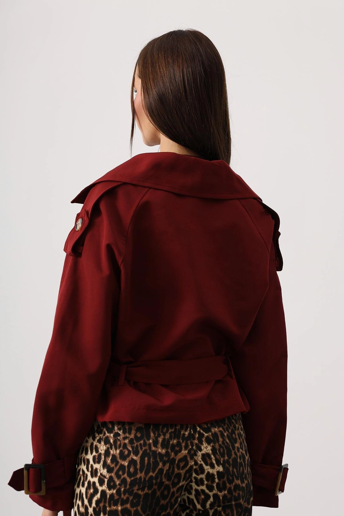 Burgundy Cropped Trench Jacket Belted Double Breasted Short Coat Women's Trench