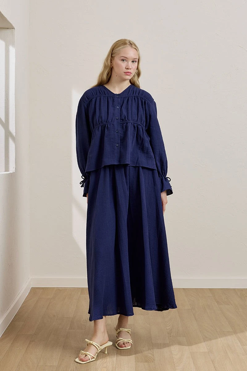 Cotton Muslin Matching Set - Button-Front Ruffle Blouse & High-Waist Balloon Skirt