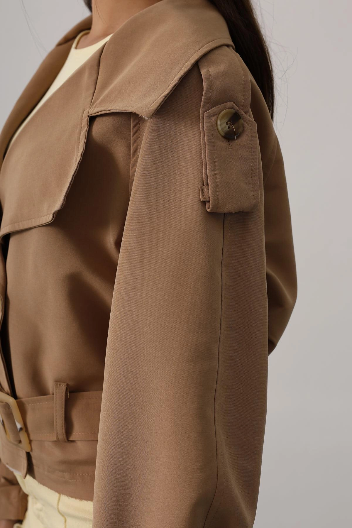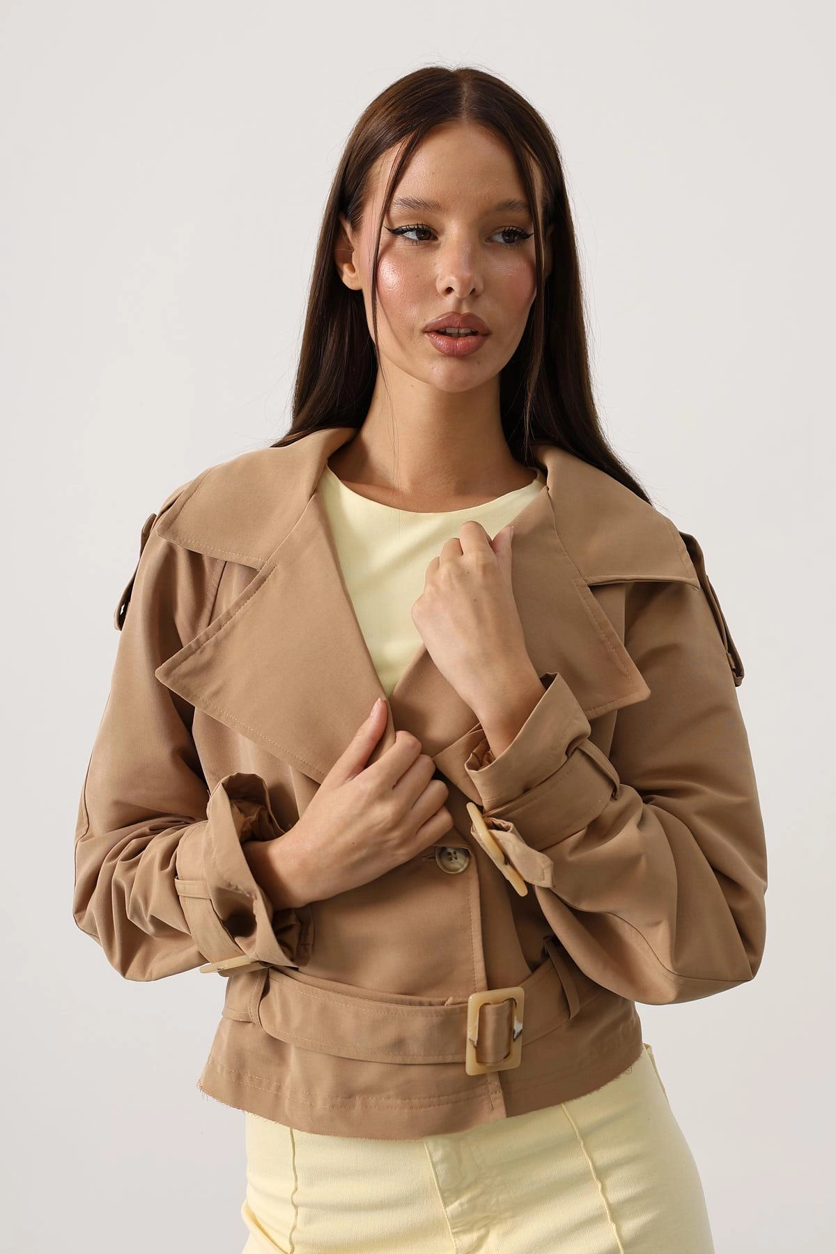 Cropped Belted Trench Coat Camel Short Double Breasted Women's Jacket