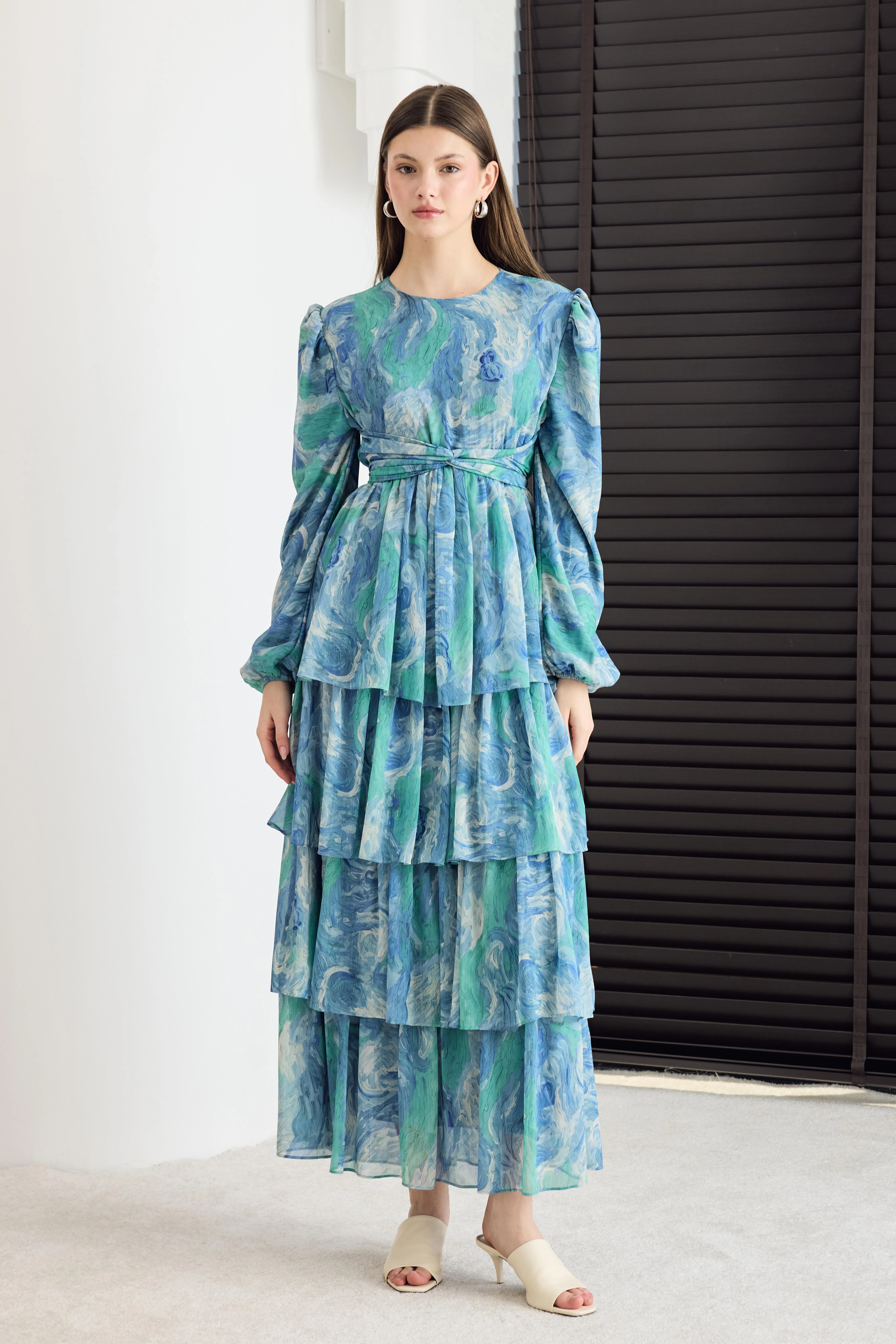 Dreamy Watercolor Tiered Dress Elegant Blue-Green Print Maxi Dress