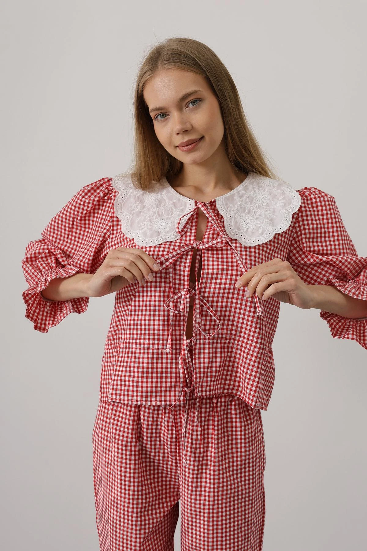 Gingham Co-ord Set Lace Collar Crop Top and High Waist Flare Pants