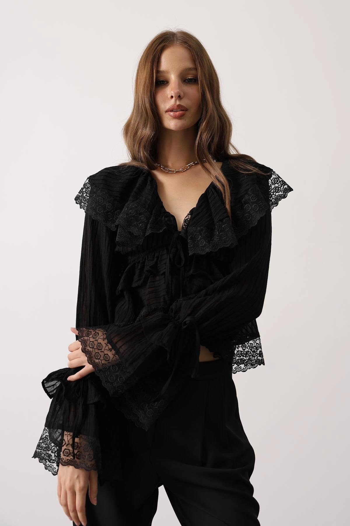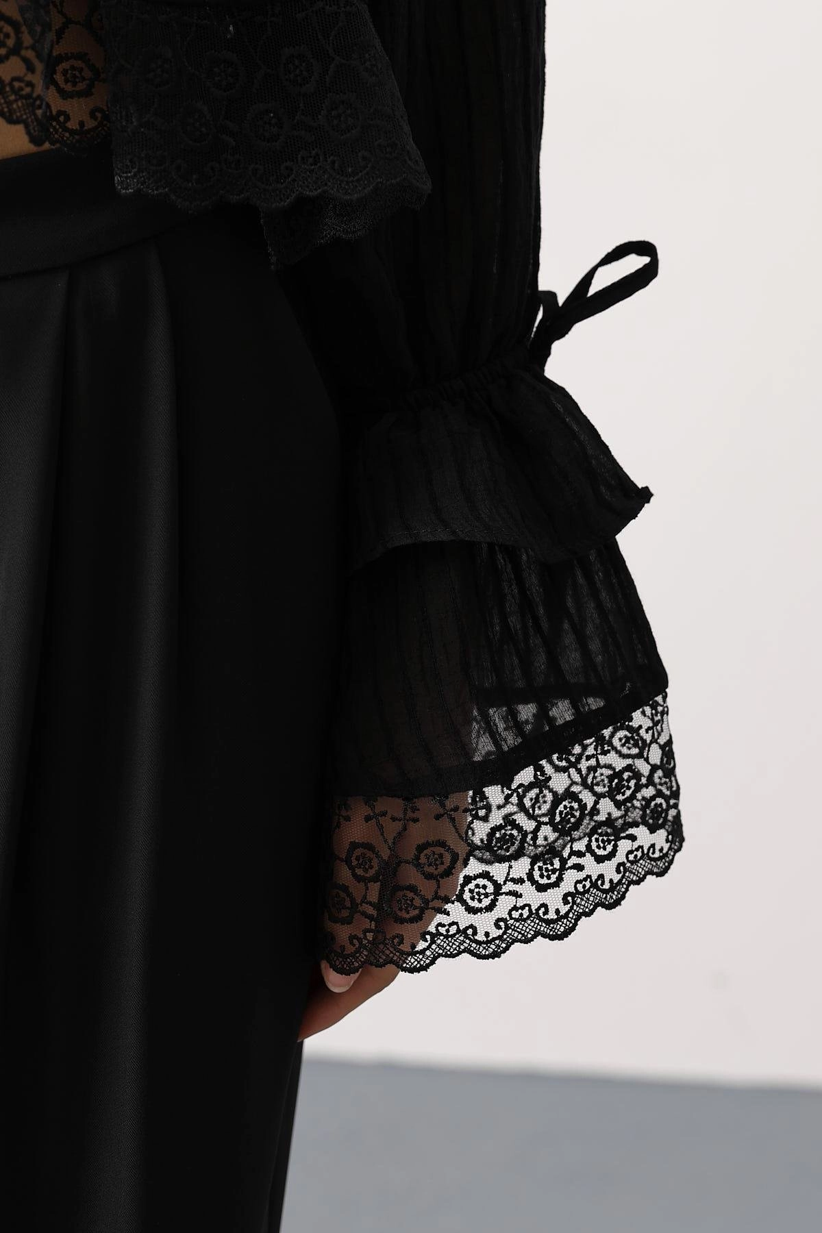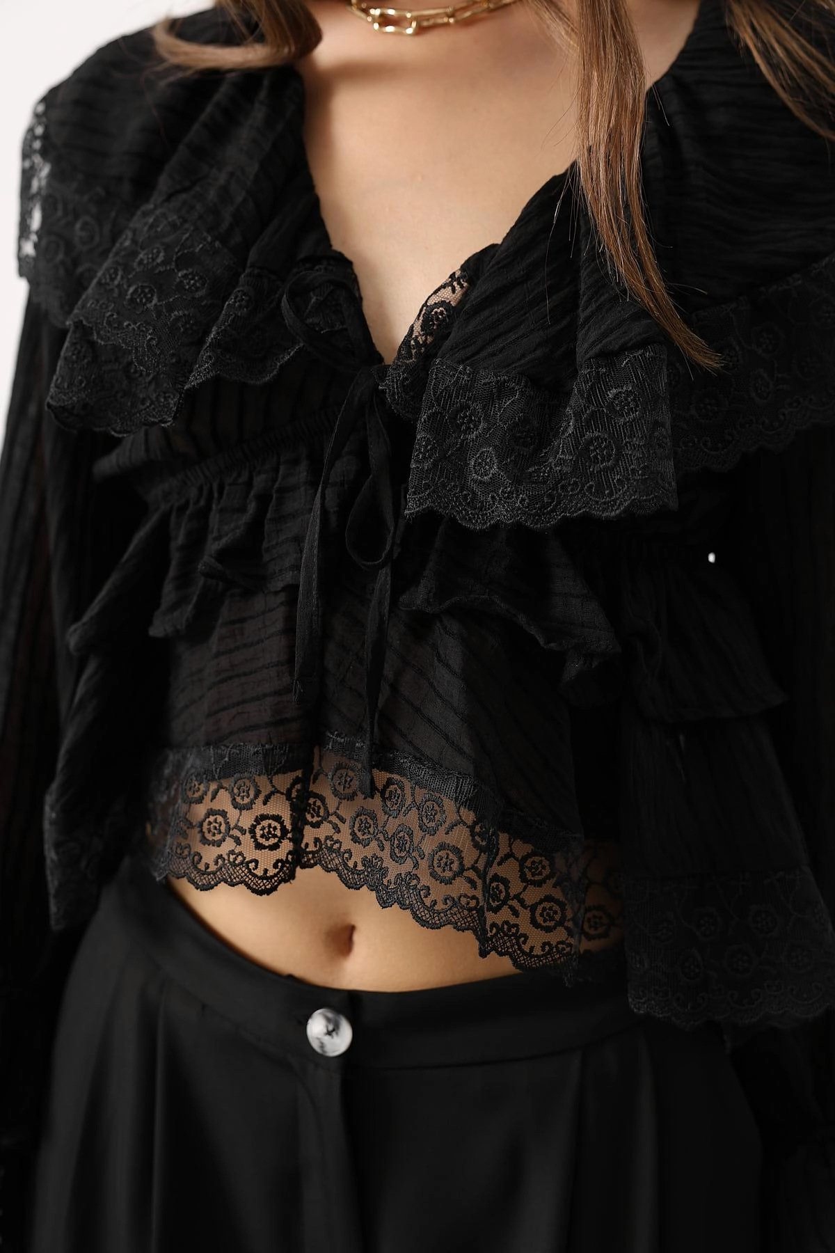 Gothic Black Lace Crop Top Ruffle Blouse Long Sleeve Victorian Romantic Dark Academia Women Fashion Vintage Style Shirt
