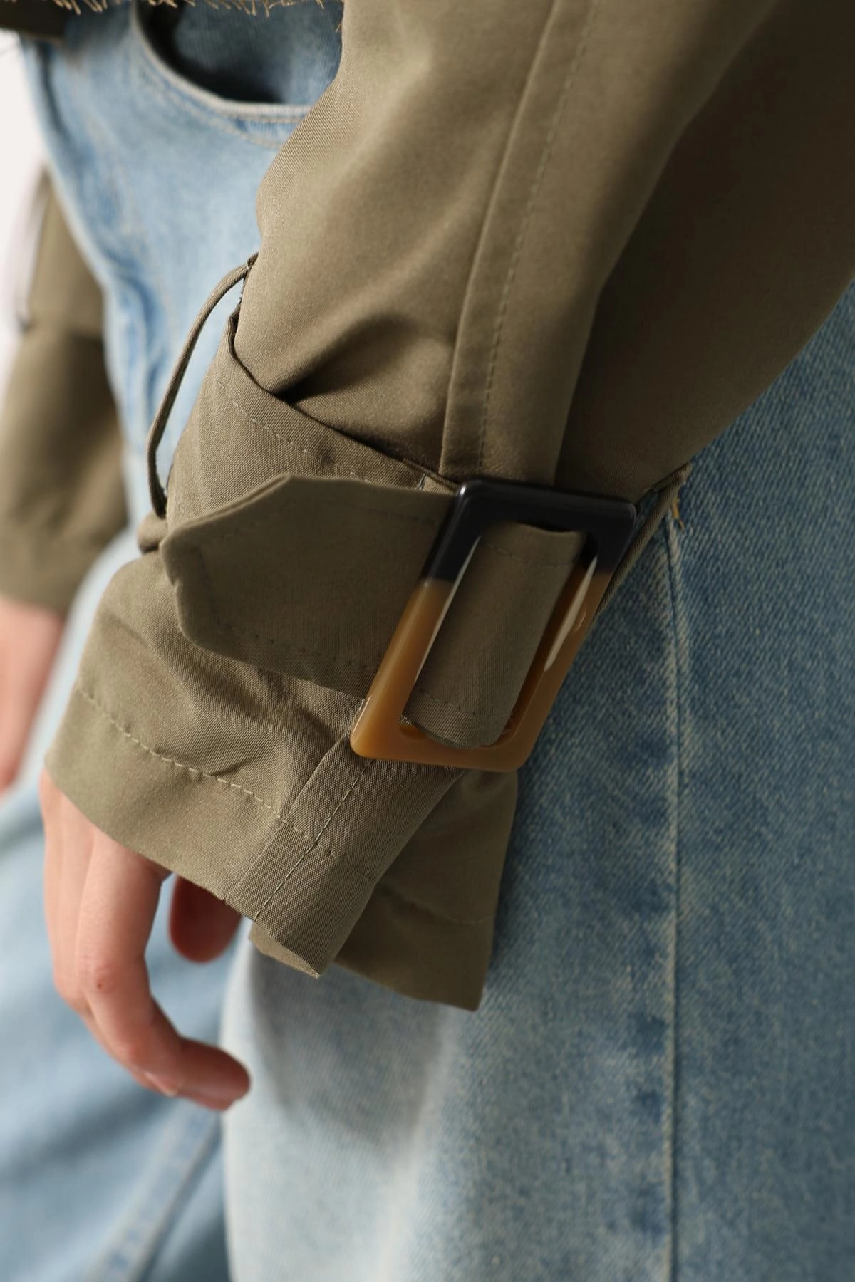 Elevate your everyday look with this khaki cropped trench jacket — a chic, modern take on the timeless trench. This belted, double-breasted short trench features statement buckle details at the cuffs, a wide lapel, and a flattering waist-cinch that pairs beautifully with high-rise denim or tailored ...