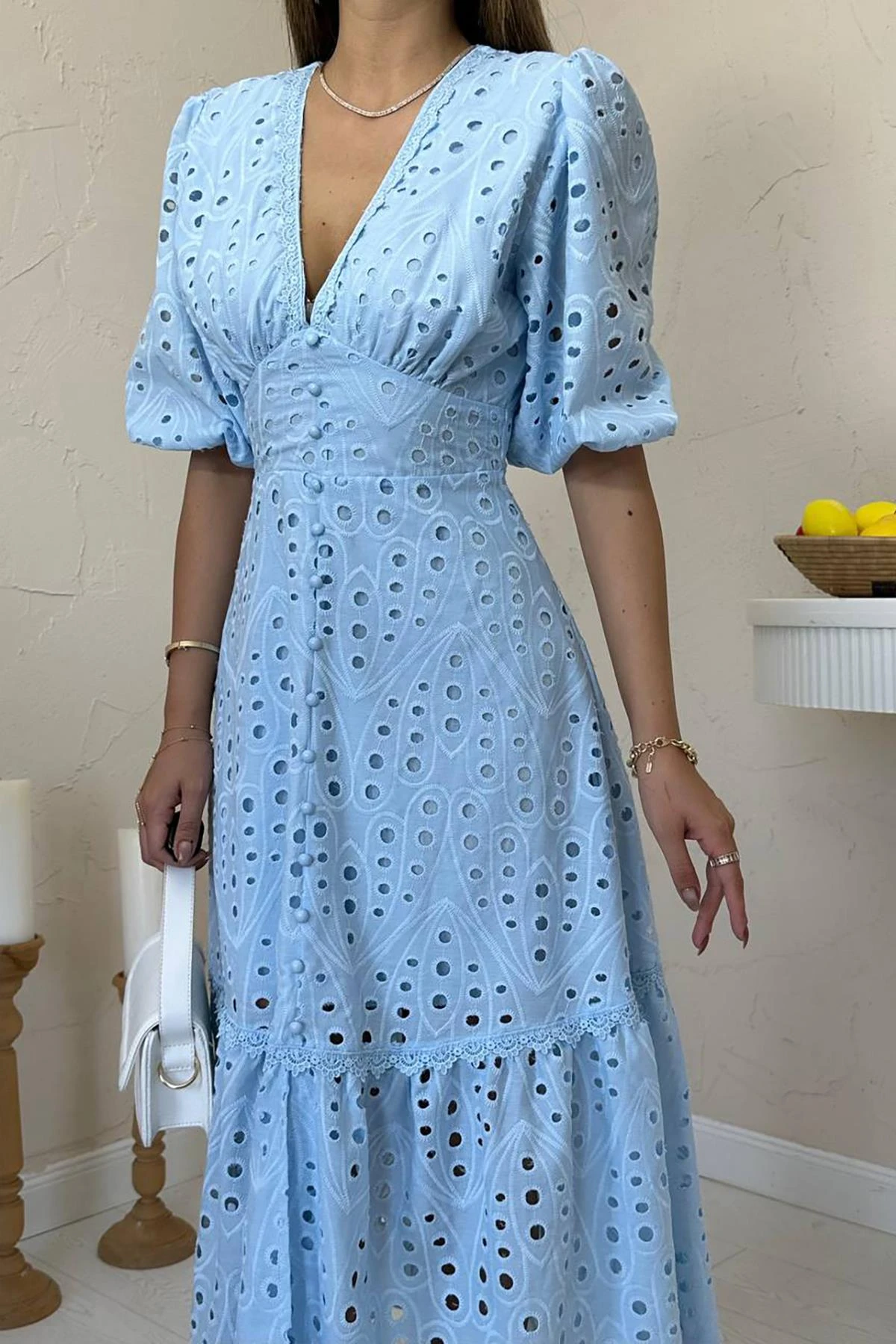 Light Blue Eyelet Puff Sleeve Midi Dress V Neck Summer Boho Cotton Dress Romantic Vintage Style Wedding Guest Dress