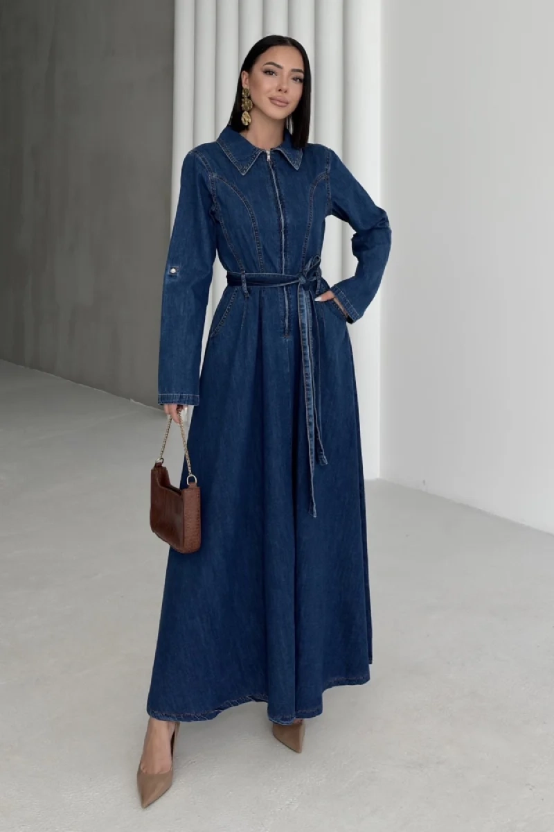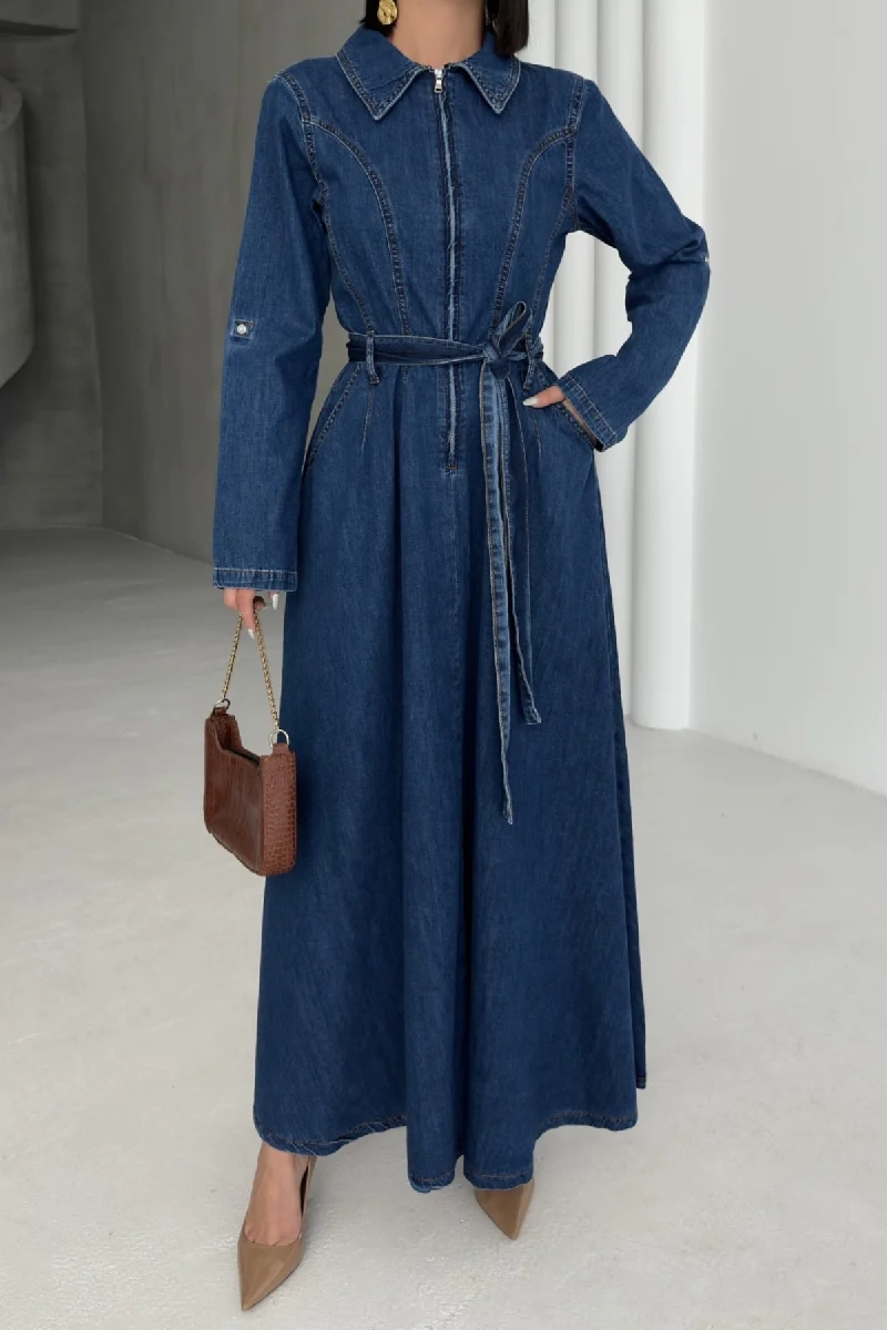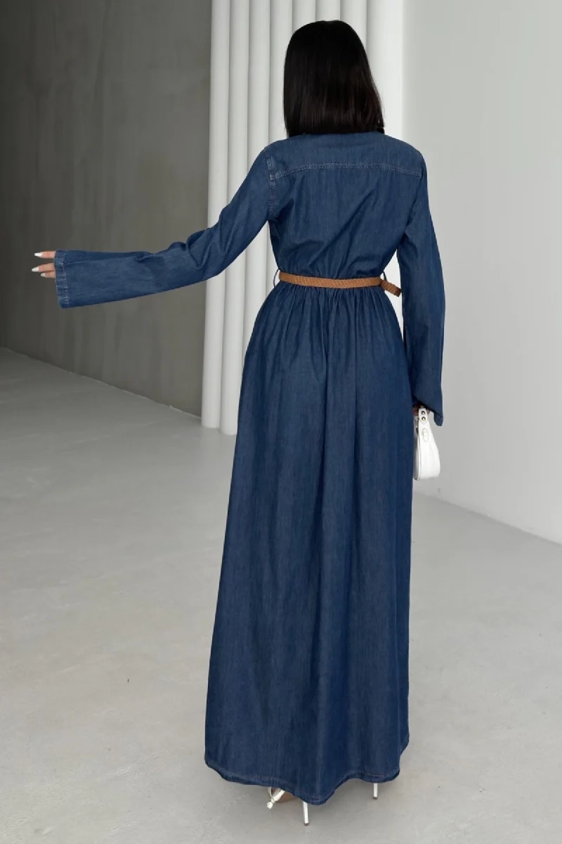 Long Sleeve Denim Maxi Dress Belted Vintage Style Blue Jean Shirt Dress Floor Length Casual