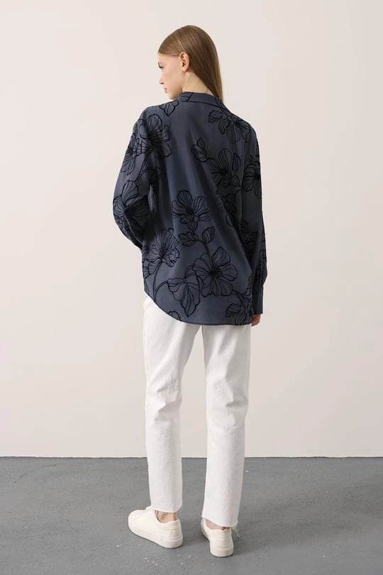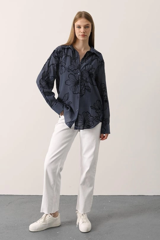 Oversized Navy Blue Floral Blouse | Relaxed Button Down Shirt | Long Sleeve Textured Flower Tunic Top