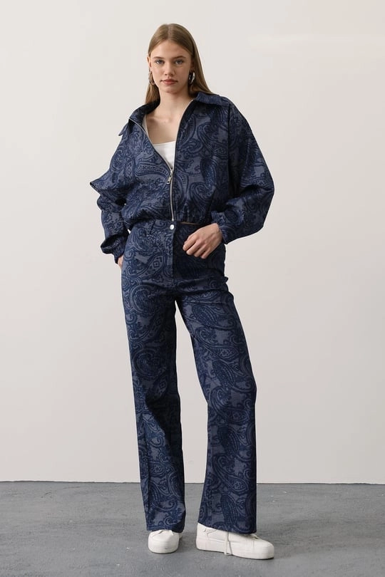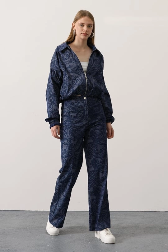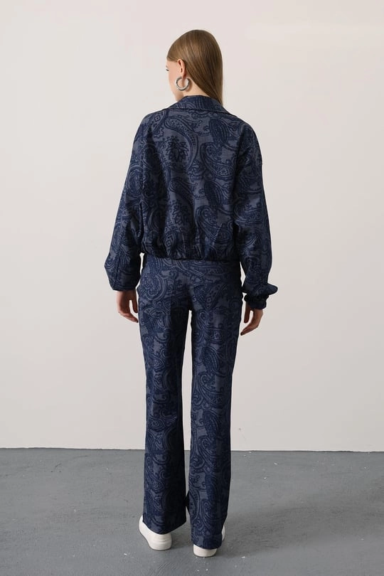 Paisley Two Piece Set | Navy Blue Two Piece Set | Bomber Jacket and Wide Leg Trousers Matching Set