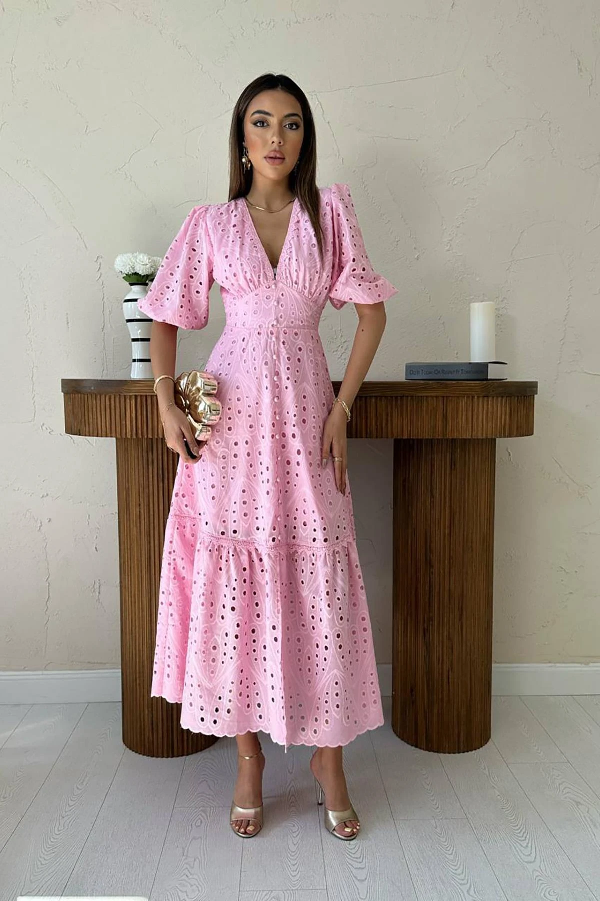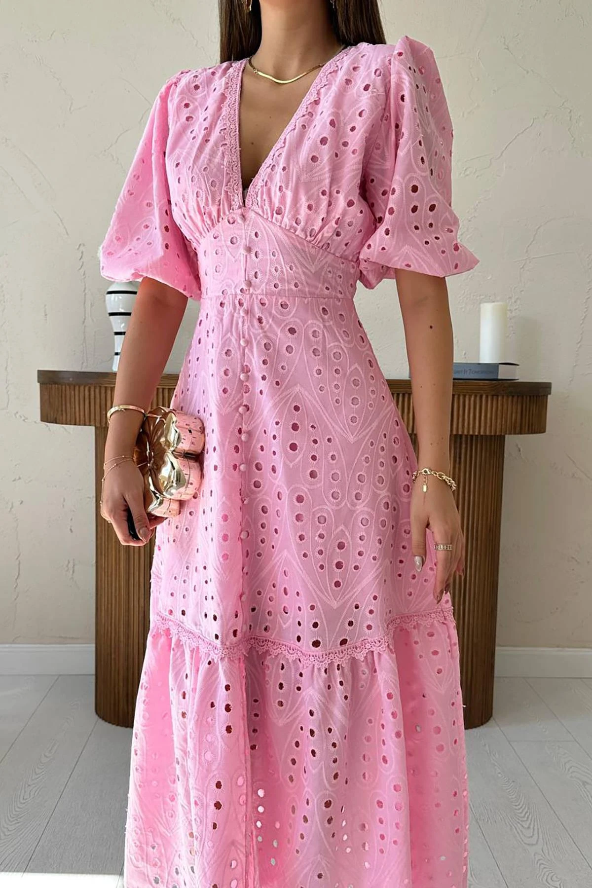 Pink Eyelet Midi Dress V-Neck Cotton Summer Dress Puff Sleeves Tiered Boho Dress Embroidered Feminine Party Dress