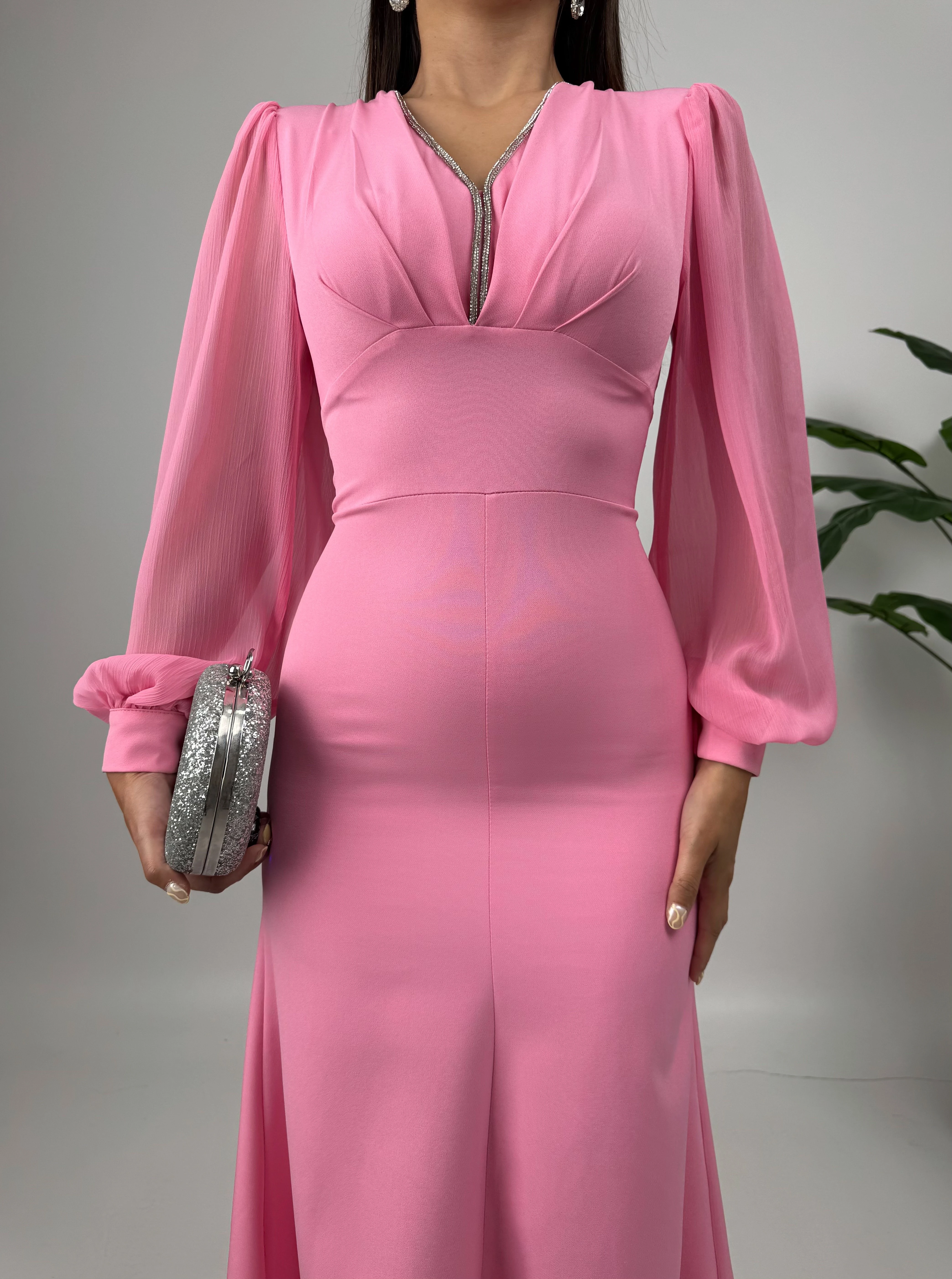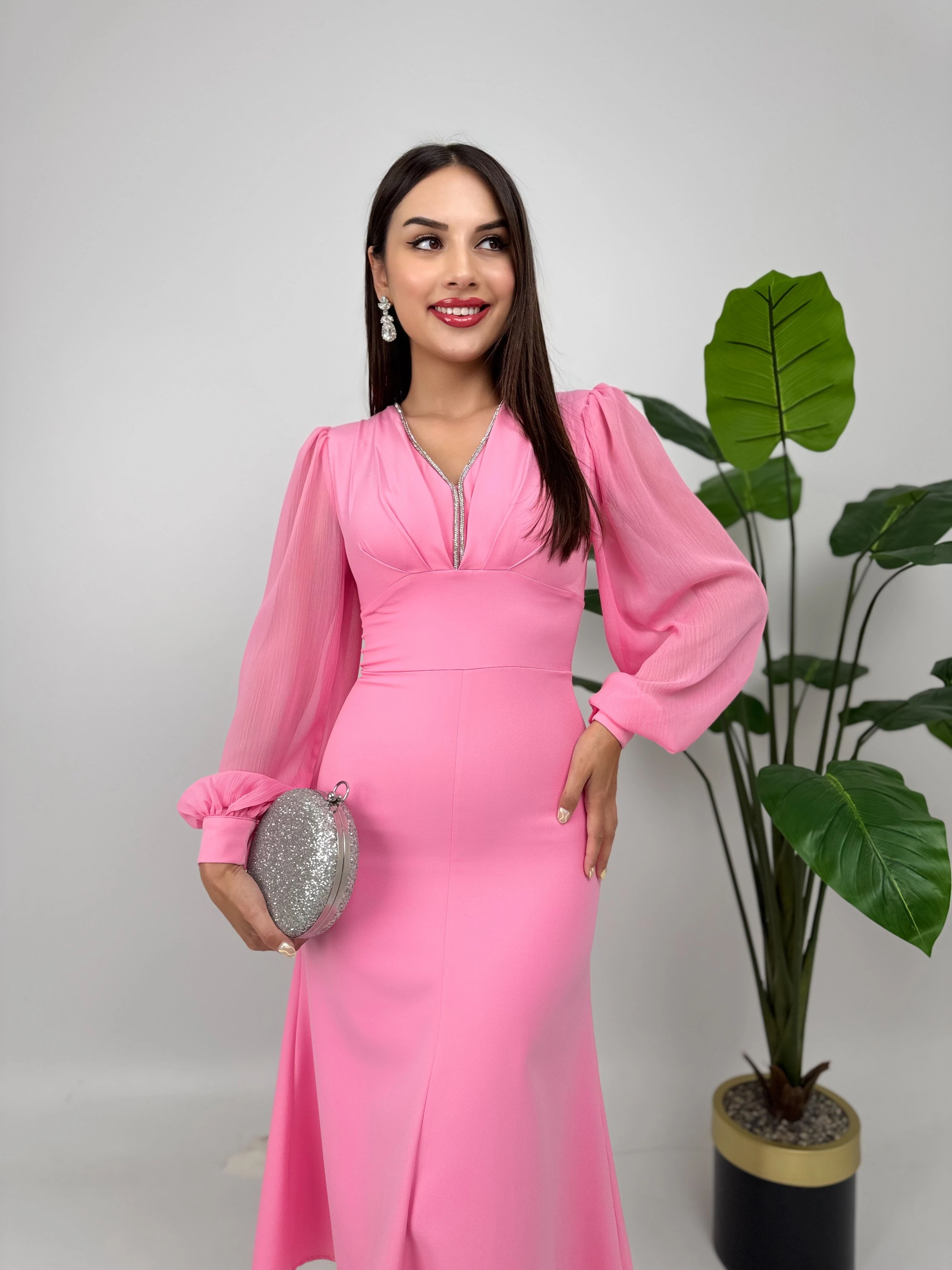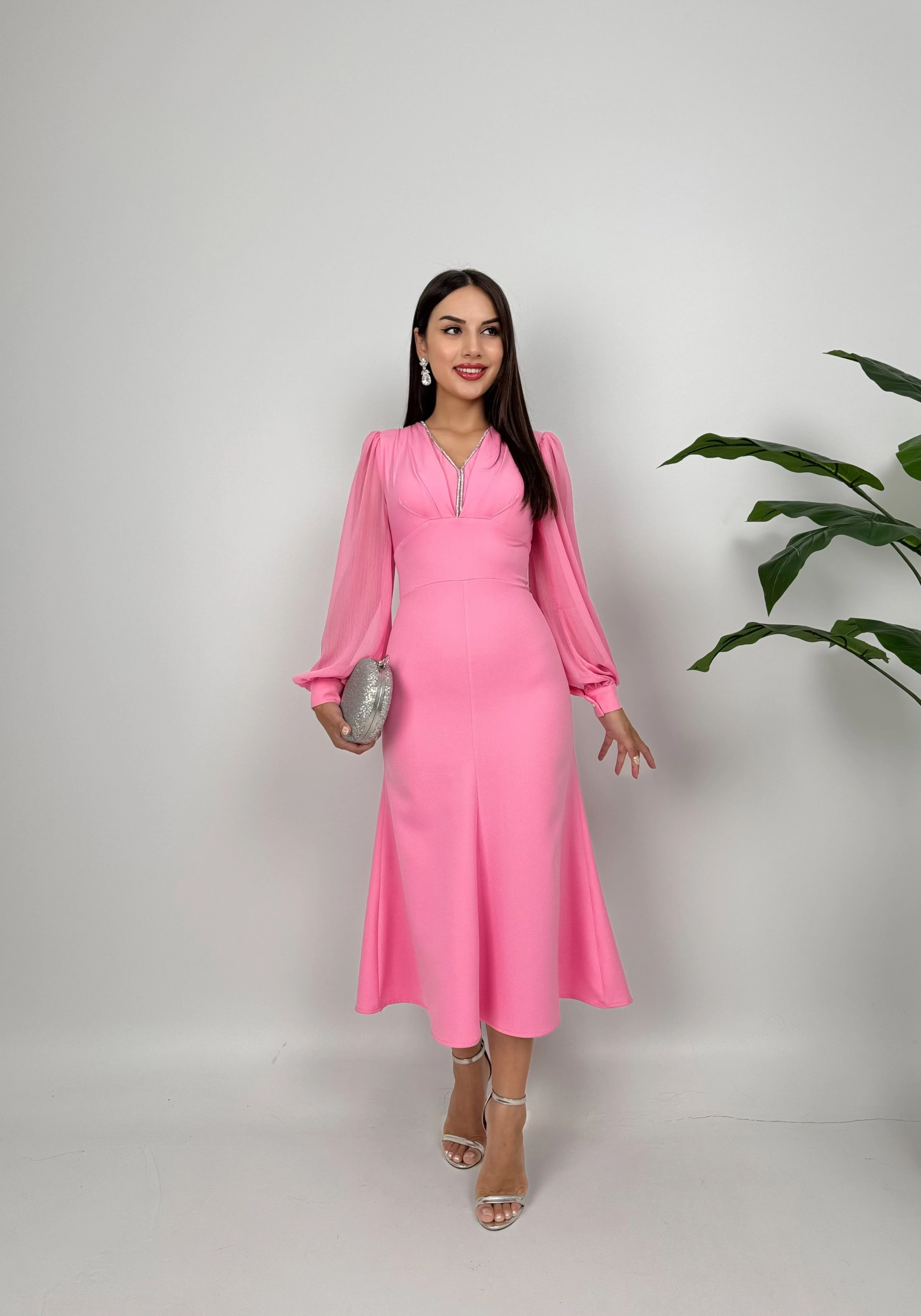 Pink Midi Dress Long Sleeve Formal Wedding Guest Dress Elegant Balloon Sleeve Cocktail Dress Prom Dress Party Outfit