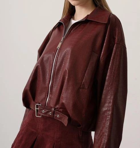 Fabric & Texture: High-quality faux leather (PU) with crocodile-embossed texture, giving a bold and luxury look. Color: Vibrant red — striking, energetic, and powerful, ideal for making a fashion statement. Cut & Silhouette: Oversized, slightly boxy silhouette that allows layering and comfort. De...