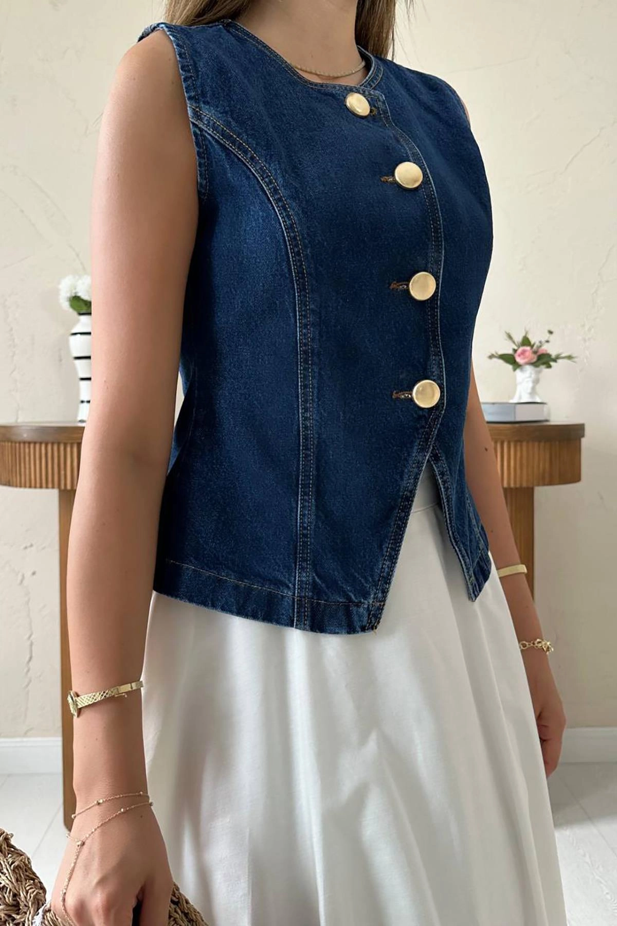 Womens Blue Denim Vest Sleeveless Button Front Jean Jacket Fitted Waistcoat Casual Boho Western Style Summer Top